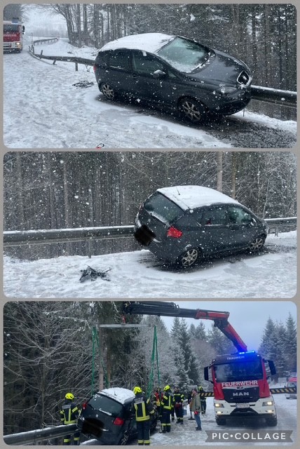 winterlichen Straßenverhältnissen von der Fahrbahn ab und blieb an an der Leitplanke hängen. Als wir an der Unfallstelle
